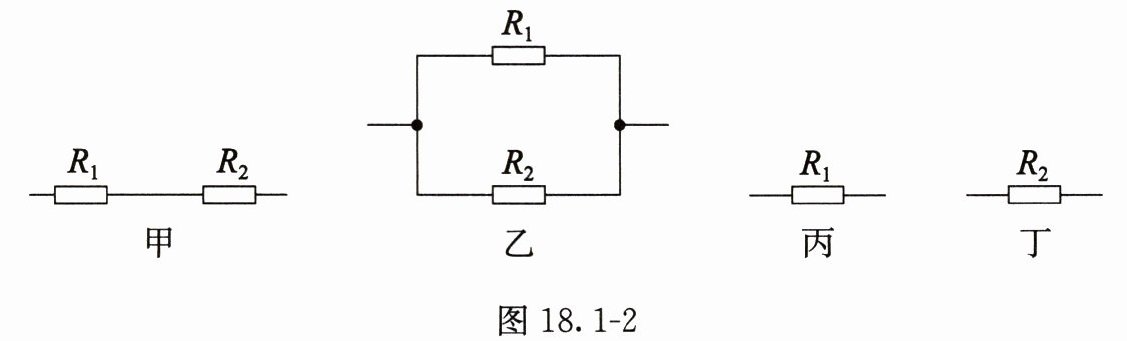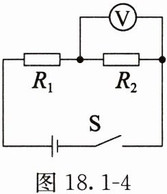 8. 如图18.1 - 4所示的电路中,电源两端的电压为6 V且保持不变,一个定值电阻的电阻$R_1$为10 Ω。闭合开关$S$后,电压表的示数为2 V,求另一个电阻为$R_2$的定值电阻在100 s内消耗的电能。