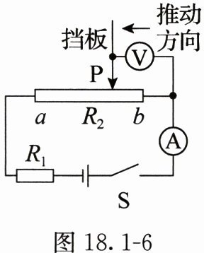 10. (多选)某同学自制了坐位体前屈测试仪,其简化电路如图18.1 - 6所示,电源电压恒为6 V,定值电阻的电阻$R_1$为20 Ω,电阻为$R_2$的粗细均匀的电阻丝总长为30 cm。闭合开关$S$,当挡板$P位于b$端时,电压表示数为0,显示成绩为0 cm,电流表示数为0.05 A;当推动挡板$P到达a$端时,显示成绩为30 cm。下列说法正确的是(