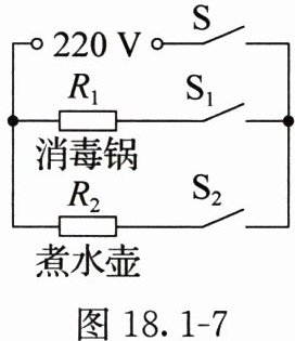 11. 功夫茶是融精神、礼仪、沏泡技艺为一体的茶道形式。泡功夫茶用的电茶炉的电路如图18.1 - 7所示,已知额定电压为220 V,两个定值电阻的电阻分别为$R_1 = 55\ Ω$、$R_2 = 44\ Ω$。求: