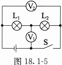 9. 如图18.1 - 5所示,电源电压保持不变,开关$S$闭合后,小灯泡$L_1$、$L_2$都能正常发光。若$V_1$、$V_2$两个电压表的示数之比为3 : 4,则相同时间内小灯泡$L_1$、$L_2$消耗的电能之比是(