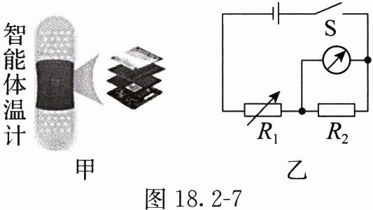 5. 小林受穿戴式智能体温计(如图18.2-7甲所示)的启发,设计了一个如图18.2-7乙所示的体温计电路图,用电表示数大小反映温度高低,热敏电阻的电阻$R_1$随温度的升高而减小,电阻为$R_2$的定值电阻起保护电路的作用。下列分析正确的是(