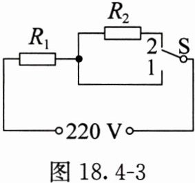 8. 某电饭锅的电路如图18.4 - 3所示,发热盘内有电阻分别为$ R_1 $、$ R_2 $的定值电阻,S是温控开关。当S接1时,电饭锅处于高温挡,电路中的电流为4 A;当温度达到一定值时,开关S自动切换到2,电饭锅处于保温挡,电路中的电流为0.25 A。求: