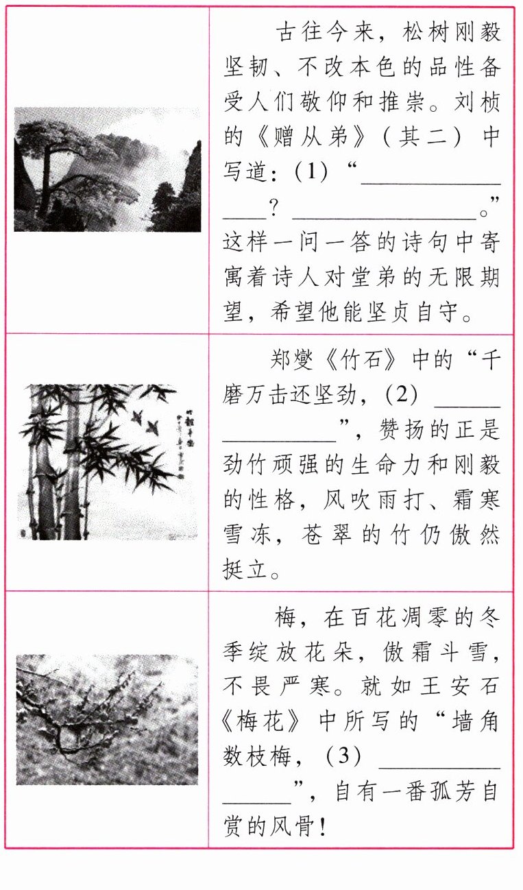 3. 在历代文人眼中,树木往往凝聚着中华民族的风骨,小文搜集整理了以下赞美“岁寒三友(松、竹、梅)”风骨的古诗,请你将其补充完整。