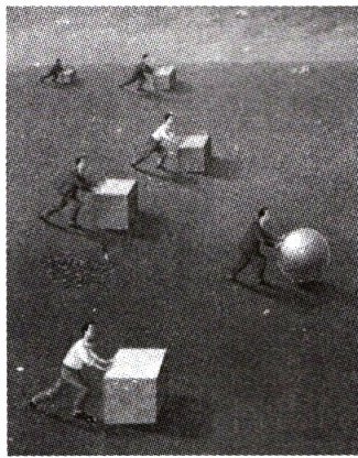 示例:打破陈规 画面中几个人在平坦的地面上推物前行。推着正方体的几人行走缓慢,只有一个推着球体的人遥遥领先;他身后留下的工具和碎屑是其勇敢地将正方体处理为球体的创新之举的有力见证。这幅漫画启示我们:不要墨守成规,敢于创新才能不断超越!因此我将其命名为“打破陈规”。(命名合理,理由围绕画面内容及寓意,言之成理即可)