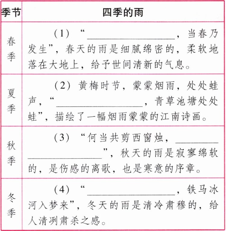 3. 四季之雨,四时之美,请你分门别类辑古诗,补全空缺处的诗句。
