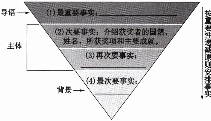 2. 消息写作中,正文的结构通常是按照重要性递减的原则安排的,即所谓“倒金字塔结构”。其中导语部分集中讲述最重要的新闻事实。之后随文章的展开,事实的重要性逐渐减弱。如果有相关的背景材料,一般放在新闻事实的后面。