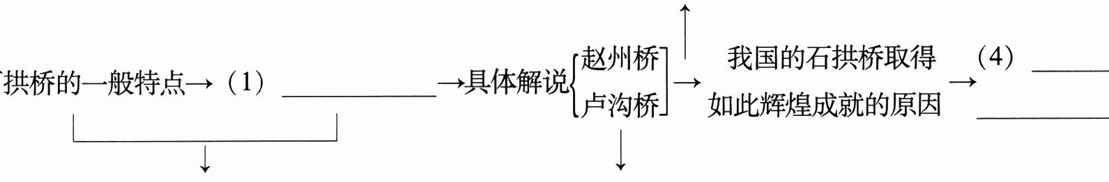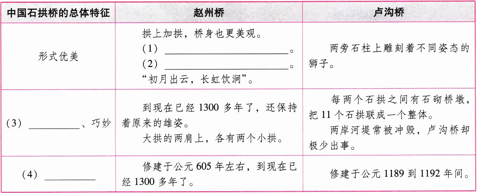 |形式优美|拱上加拱,桥身也更美观。(1)______。(2)“______”。|两旁石柱上雕刻着不同姿态的狮子。|
