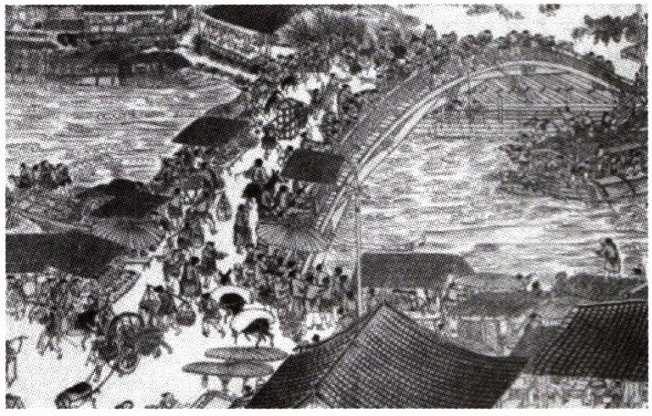 一艘准备驶过拱桥的巨大漕船的细节描绘,一直为人们所称道:船正在放倒桅杆准备过桥,船夫们呼唤叫喊,握篙盘索。桥上呼应相接,岸边挥臂助阵,过往行人聚集在桥头围观。而那些赶脚、推车、挑担的人们,却无暇一顾。这紧张的一幕,成为全画的一个高潮。