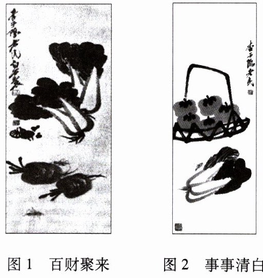 示例:图1《百财聚来》以白菜、萝卜、蘑菇三种蔬菜入画,三种泛指各种、百种,“百菜”(或“白菜”)谐音“百财”,百财汇聚,寓意财源广进。图2《事事清白》以柿子、白菜入画,“柿”谐音“事”,“白菜”叶青茎白,寓意清清白白做事。这两幅画命名寓意美好,雅俗共赏。