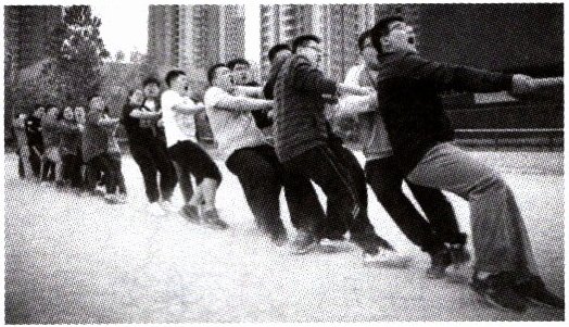 在学校秋季运动会的拔河比赛中,八年级(2)班大获全胜。下图是他们在赛场上的精彩一刻。请仔细观察,用生动的语言描述当时的场景。(200字左右)