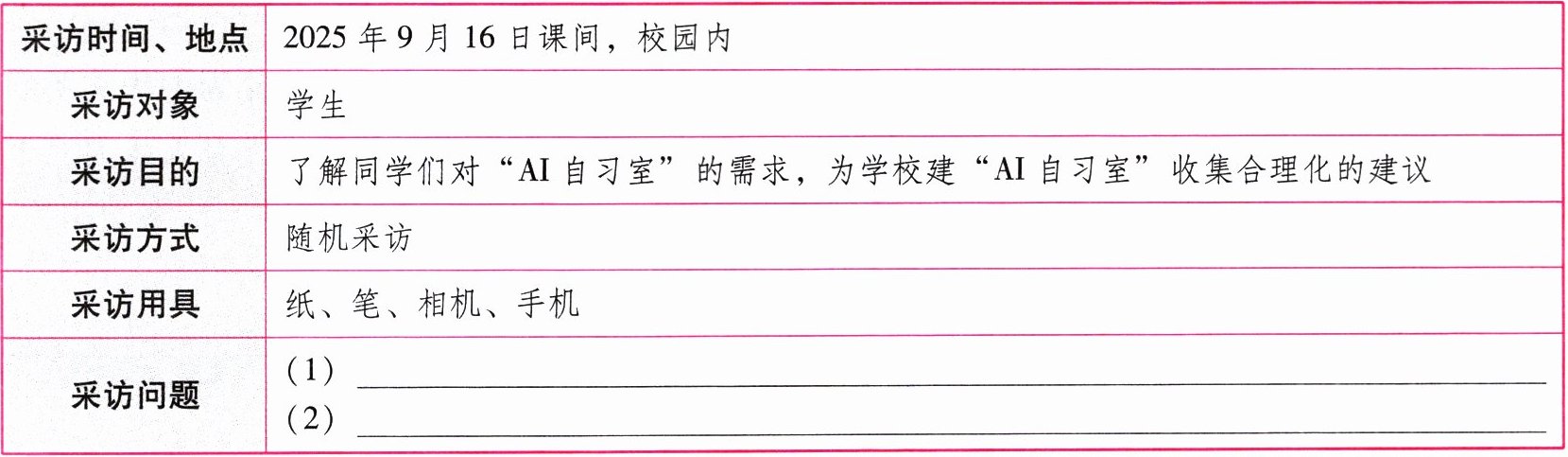 3. 学校也打算建一个“AI自习室”,现需要就同学们对“AI自习室”的需求完成一次采访任务。请按照要求,将下面新闻采访提纲的内容补充完整。