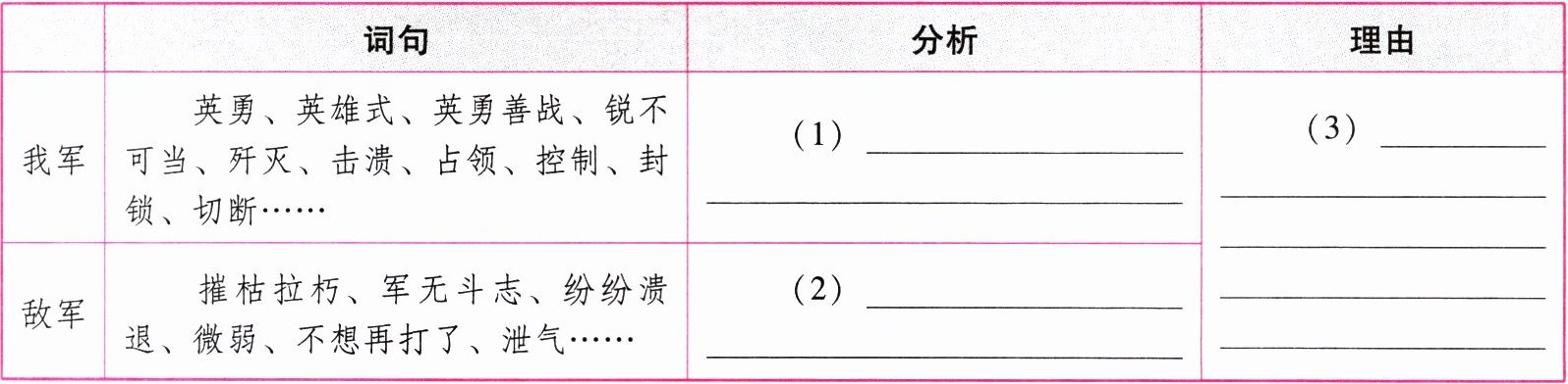 |我军|英勇、英雄式、英勇善战、锐不可当、歼灭、击溃、占领、控制、封锁、切断……|(1)______|(3)______|