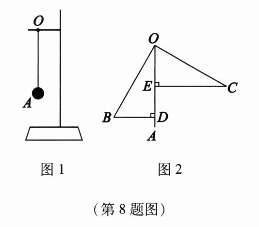 8. 小亮在物理课上学习了发声物体的振动实验后,对其作了进一步的探究:如图 1,在支架的横杆点$O$处用一根细绳悬挂一个小球$A$,小球$A$可以自由摆动,摆动过程中绳子的伸长不考虑且绳子始终是绷直的。如图 2,$OA$表示小球静止时的位置,当小亮用发声物体靠近小球时,小球从$OA$摆到$OB$位置,此时过点$B$作$BD\perp OA$于点$D$,当小球摆到$OC$位置时,过点$C$作$CE\perp OA$于点$E$,测得$BD = 7\mathrm{cm}$,$OE = 7\mathrm{cm}$。求证:$OB\perp OC$。(图中的点$A$、$B$、$O$、$C$在同一平面内)