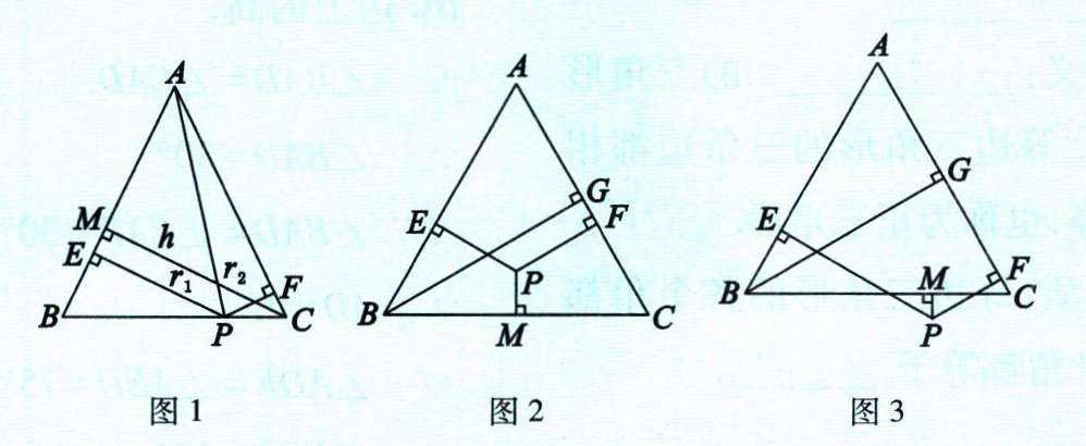 将“在$\triangle ABC$中,$AB = AC$,$P$为$BC$上一点”改成“$P$为等边三角形$ABC$内一点”,如图 2,作$PE\perp AB$,$PF\perp AC$,$PM\perp BC$,$BG\perp AC$,垂足分别为点$E$、$F$、$M$、$G$,有类似结论吗?请写出结论并证明.