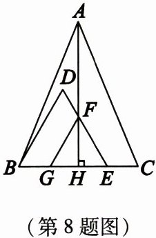 8. 如图,在等腰三角形纸片$ABC$中,$AB = AC$,$AH\perp BC$,点$H$为垂足.小花放入一张等边三角形纸片$BDE$,点$E$在$BC$边上,$F$为$AH$与$DE$的交点,小都又放入一张等边三角形纸片$EFG$,点$G$在$BC$边上.小花和小都量得$EF = 5$,$CE = 3$,那么等腰三角形纸片的底边$BC$的长度为(