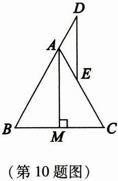 10. 如图,在$\triangle ABC$中,$AB = AC$,过点$A$作$AM\perp BC$于点$M$,点$D$在$BA$的延长线上,$E$是$AC$边上一点,且$AD = AE$,连结$DE$,试说明$DE\perp BC$.