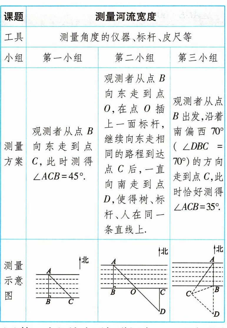 $m$.(3) 第三小组认为只要测得$BC$的长度就能得到河宽$AB$,你认为第三小组的方案可行吗?如果可行,请给予证明;如果不可行,请说明理由.