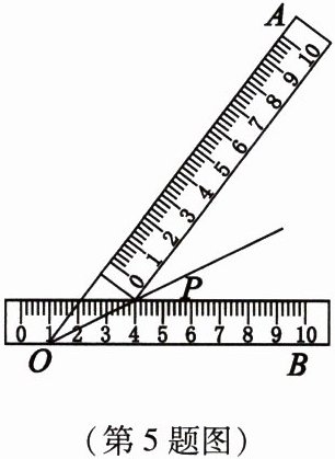 5. 小明只用两把完全相同的长方形直尺就可以作出一个角的平分线。如图,一把直尺压住射线$OB$,另一把直尺压住射线$OA$,且与第一把直尺交于点$P$,小明说:“射线$OP$就是$\angle BOA$的平分线。”他这样做的依据是(