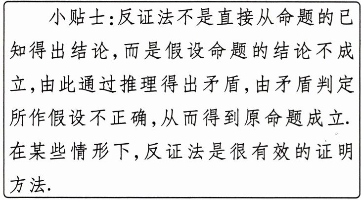 小贴士:反证法不是直接从命题的已知得出结论,而是假设命题的结论不成立,由此通过推理得出矛盾,由矛盾判定所作假设不正确,从而得到原命题成立.在某些情形下,反证法是很有效的证明方法.