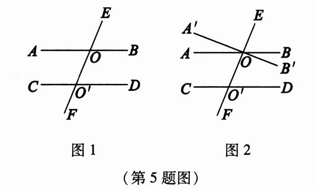 如图1,我们想要证明“如果直线AB、CD被直线EF所截,且AB//CD,那么∠EOB = ∠EO'D”.如图2,假设∠EOB ≠ ∠EO'D,过点O作直线A'B',使∠EOB' = ∠EO'D,可得A'B'//CD.这样过点O就有两条直线AB、A'B'都平行于直线CD,这与基本事实