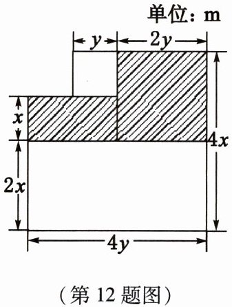 12. 一处住房的平面结构示意图如图所示,房子的主人打算把卧室(阴影部分)以外的部分全都铺上地砖,那么至少需要多少平方米的地砖?如果某种地砖的价格是 $a$ 元$/m^{2}$,那么购买所需地砖至少需要多少元?