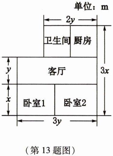 13. (1)如图是小颖家新房的户型图,小颖的爸爸打算把两个卧室以外的部分都铺上地砖,至少需要多少平方米的地砖?如果某种地砖的价格为 a 元/$m^{2}$,那么购买地砖至少需要多少元?