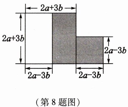8. 如图,一块空地是由边长分别为 $(2a + 3b)$ m、$(2a - 3b)$ m 的两个正方形组成的,计划在左侧留出一个长方形区域作水池,剩余阴影部分作花坛.