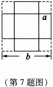 7. 如图,有一张边长为 $b$ 的正方形纸板,在它的四角各剪去一个边长为 $a$ 的正方形,然后将四周突出的部分折起,制成一个无盖的长方体纸盒. 用 $M$ 表示其底面积与侧面积的差,则 $M$ 可因式分解为(