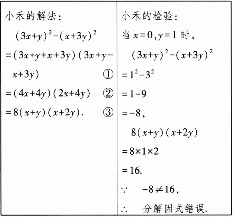 9. 在分解因式 $(3x + y)^{2}-(x + 3y)^{2}$ 时,小禾通过代入特殊值检验时,发现左右两边的值不相等. 下面是他的解答和检验过程,请认真阅读并完成相应的任务.