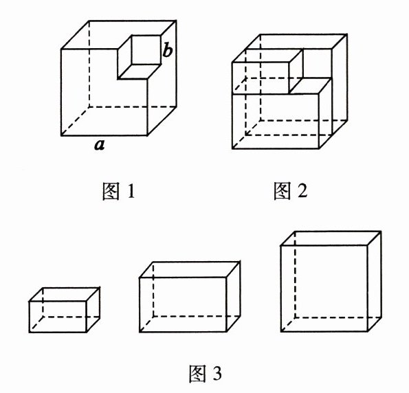 在一个边长为 $a$ 的正方体中挖出一个边长为 $b$ 的正方体(如图 1),然后利用切割的方法把剩余的立体图形(如图 2)分成三部分(如图 3),这三部分长方体的体积依次为 $b^{2}(a - b)$、$ab(a - b)$、$a^{2}(a - b)$.
