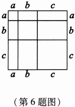 6. 通过不同的方法计算图形的面积,可以得到一个数学等式. 如图,这个大正方形边长为 $a + b + c$,用 $(a + b + c)^2$ 可求得其面积;同时,大正方形的面积也等于 6 个长方形和 3 个正方形的面积之和. 已知 $a + b + c = 8$,$a^2 + b^2 + c^2 = 26$,则 $ab + bc + ac$ 的值是(
