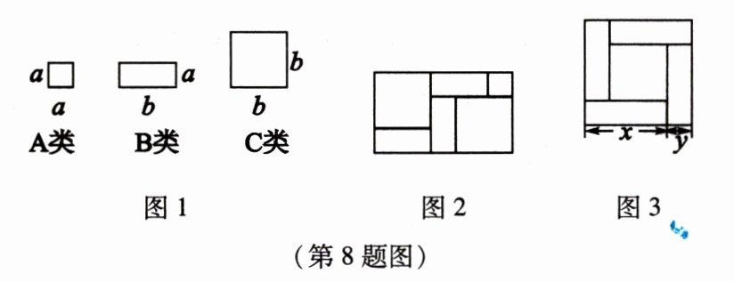 8. 如图 1,有足够多的边长为 $a$ 的小正方形(A 类),长为 $b$、宽为 $a$ 的长方形(B 类)以及边长为 $b$ 的大正方形(C 类),小明发现利用图 1 中的三种材料可以拼出一些长方形来解释某些等式。