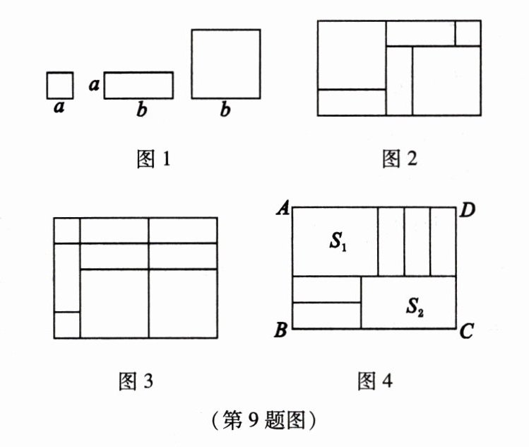 9. 小明和小丽玩纸片拼图游戏,他们发现利用图 1 中的三种类型的纸片可以拼出一些图形来解释某些等式. 例如,由图 2,我们可以得到 $(a + 2b)(a + b) = a^2 + 3ab + 2b^2$.