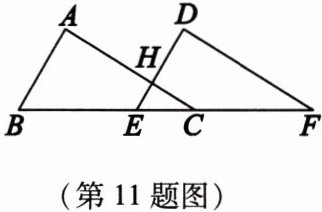 11. 如图,△ABC≌△DEF,点 B、E、C、F 在同一条直线上,∠A = 88°,∠B = 60°,AB = 6,EH = 2.