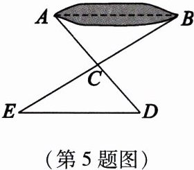 5. 如图,有一池塘,要测量池塘两端 $ A $、$ B $ 之间的距离,可先在平地上取一个点 $ C $,从点 $ C $ 不经过池塘可以直接到达点 $ A $ 和点 $ B $,连结 $ AC $ 并延长到点 $ D $,使 $ CD = CA $,连结 $ BC $ 并延长到点 $ E $,使 $ CE = CB $,连结 $ DE $,那么量出 $ DE $ 的长就是 $ A $、$ B $ 之间的距离。为什么?请结合解题过程,完成本题的证明。