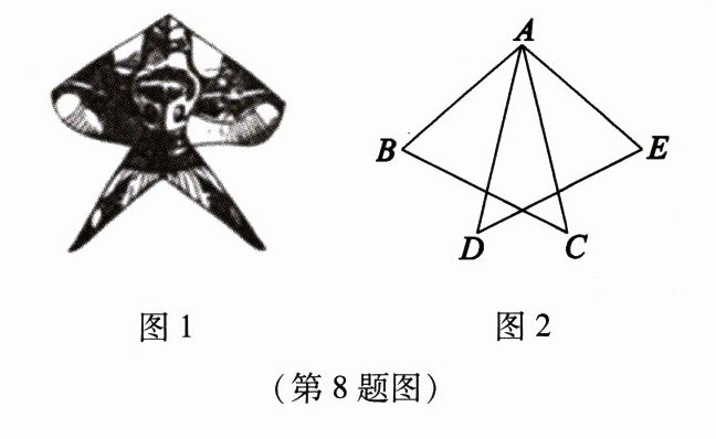 8. 图 1 是小军制作的燕子风筝,燕子风筝的骨架如图 2 所示,$ AB = AE $,$ AC = AD $,$ \angle BAD = \angle EAC $,$ \angle C = 50° $,求 $ \angle D $ 的大小。