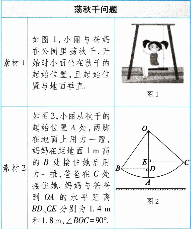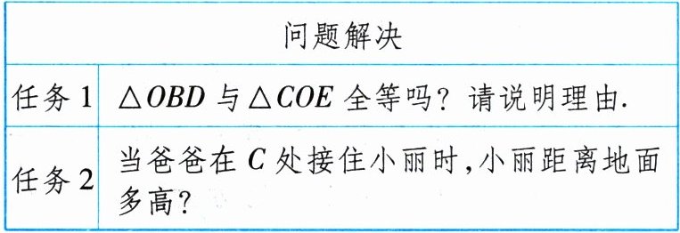 任务 2:由 $ \triangle BOD \cong \triangle OCE $,可以得到 $ BD = OE = 1.4 $ m,$ EC = OD = 1.8 $ m,进而可求出当爸爸在 $ C $ 处接住小丽时,小丽距离地面的高度.