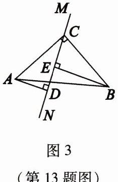 13. 在 $ \triangle ABC $ 中,$ \angle ACB = 90° $,$ AC = BC $,直线 $ MN $ 经过点 $ C $,且 $ AD \perp MN $ 于点 $ D $,$ BE \perp MN $ 于点 $ E $.