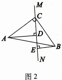(2)当直线 $ MN $ 绕点 $ C $ 旋转到图 2 的位置时,$ \triangle ADC $ 与 $ \triangle CEB $ 依然全等吗?此时 $ DE $ 与 $ AD - BE $ 有怎样的数量关系?