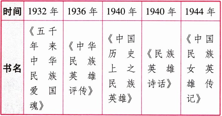 |书名|《五千年来中华民族爱国魂》|《中华民族英雄评传》|《中国历史上之民族英雄》|《民族英雄诗话》|《中国民族女英雄传记》|