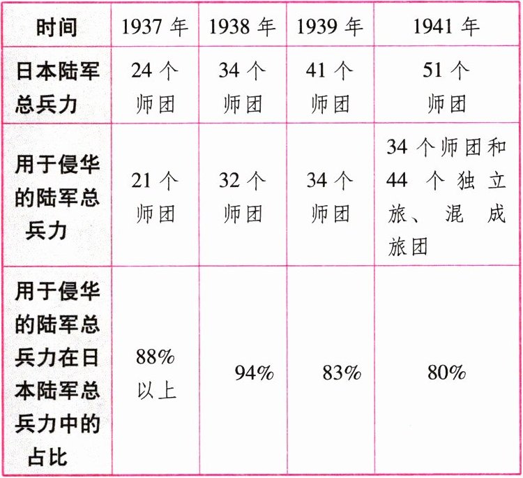 | 用于侵华的陆军总兵力 | 21个师团 | 32个师团 | 34个师团 | 34个师团和44个独立旅、混成旅团 |
