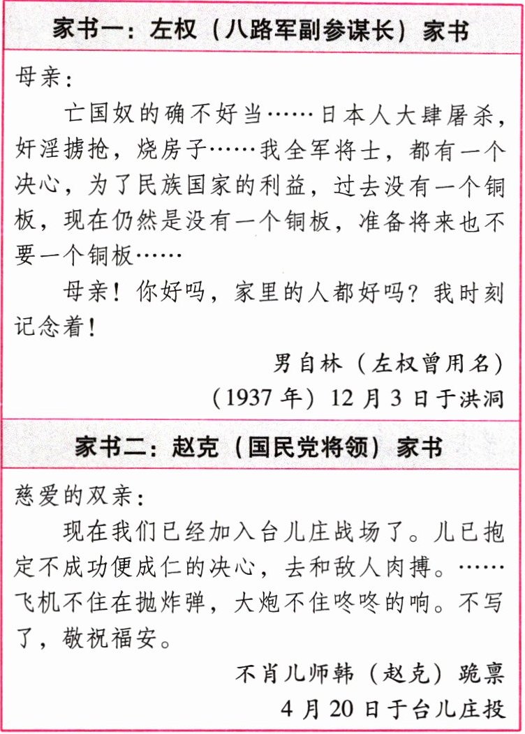 (2)请分别简述家书一的背景和家书二反映事件的影响,并写出你从两封家书中感受到的民族精神。