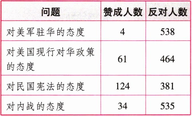 【解题思路】根据题干并结合所学知识可知,调查统计表显示了绝大多数人反对美国在华驻军及其对华政策,反对新颁布的民国宪法,反对内战,这体现了民众对国民党统治集团内外政策的不满,表明国民党统治集团失去了民众的信任,故B项正确。A项中国共产党在内战中已占上风,发生在1947年刘邓大军千里跃进大别山之后,时间不符且表格也不涉及,排除。C项政治协商会议已经召开,表格呈现的是全面内战爆发后的史事,时间不符,排除。D项美国对华政策左右中国内战,表格中只有两条涉及美国,不能涵盖全部材料信息,且材料信息的主语是中国民众,不是美国,排除。