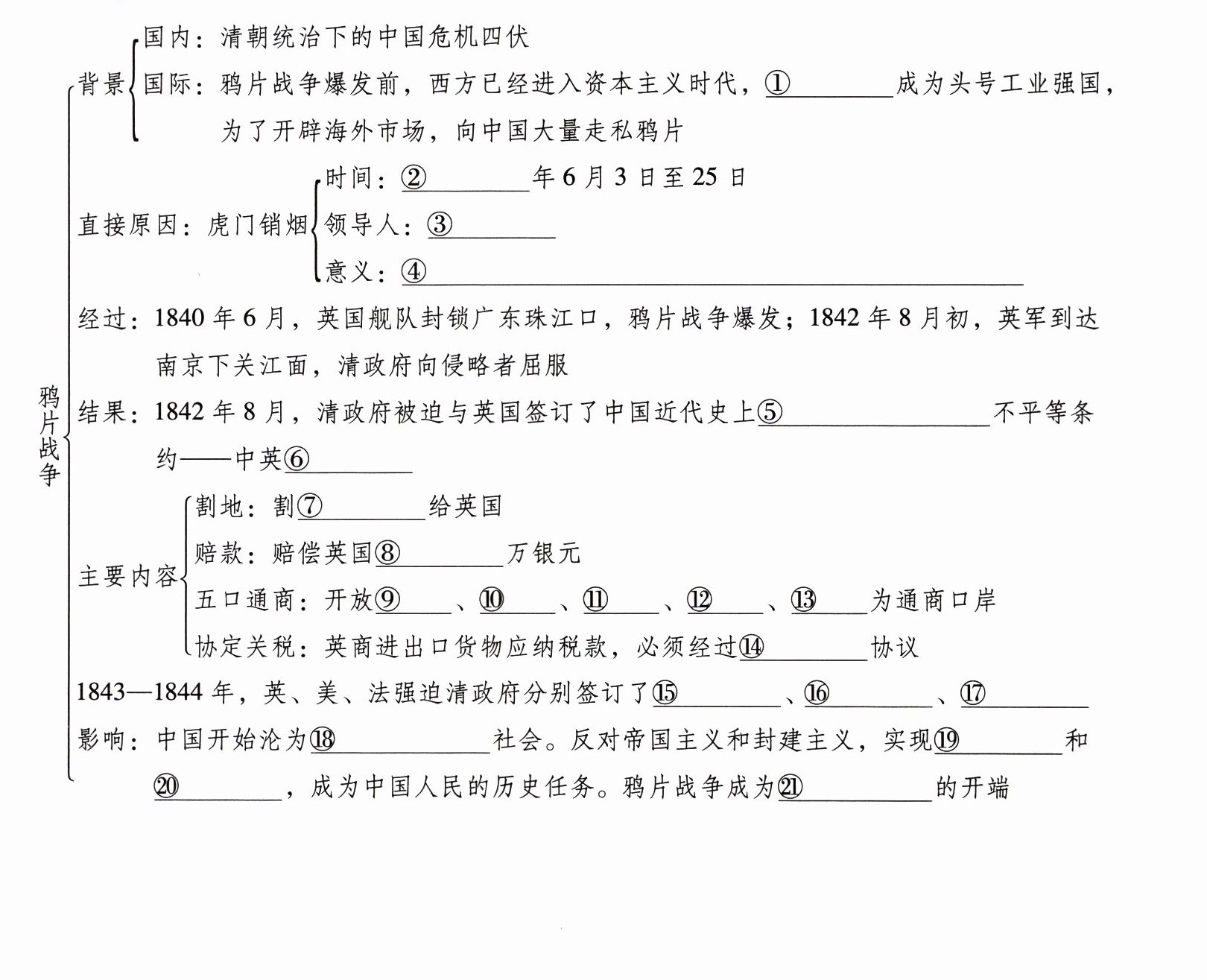 ①英国 ②1839 ③林则徐 ④是中国人民禁烟斗争的伟大胜利,显示了中华民族反抗外来侵略的坚强意志 ⑤第一个丧权辱国的 ⑥《南京条约》 ⑦香港岛 ⑧2100 ⑨广州 ⑩福州 ⑪厦门 ⑫宁波 ⑬上海 ⑭双方 ⑮中英《虎门条约》 ⑯中美《望厦条约》 ⑰中法《黄埔条约》 ⑱半殖民地半封建 ⑲民族独立 ⑳人民解放 ㉑中国近代史