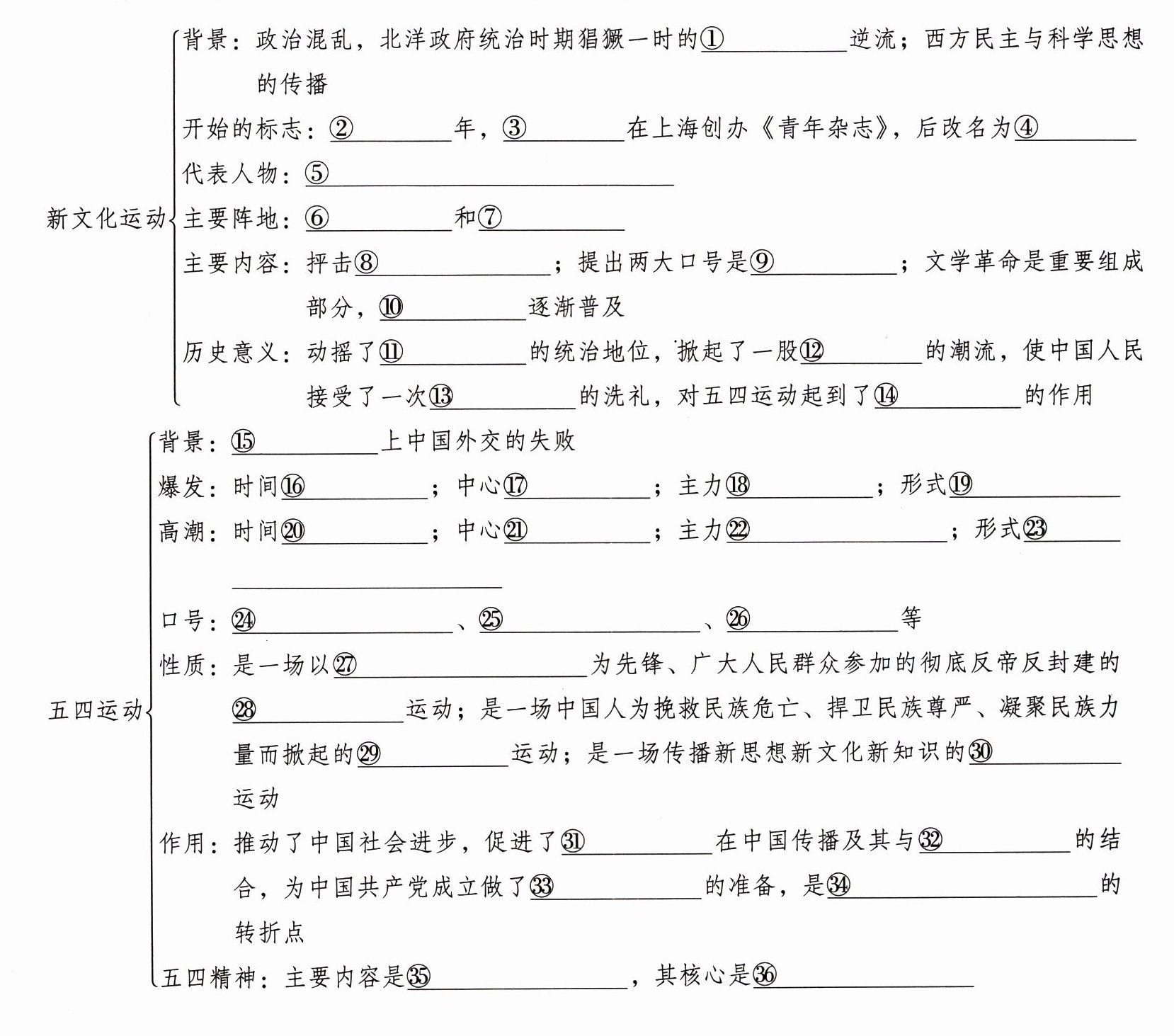 ①尊孔复古 ②1915 ③陈独秀 ④《新青年》 ⑤陈独秀、李大钊、胡适、鲁迅等 ⑥《新青年》 ⑦北京大学 ⑧旧道德和旧文化 ⑨民主与科学 ⑩白话文 ⑪封建道德礼教 ⑫思想解放 ⑬民主与科学 ⑭思想宣传和铺垫 ⑮巴黎和会上中国外交的失败 ⑯1919年5月4日 ⑰北京 ⑱学生 ⑲学生游行示威 ⑳1919年6月5日 21上海 22工人 23工人罢工、商人罢市 24“外争主权,内除国贼” 25“誓死力争,还我青岛” 26“废除二十一条” 27青年学生 28爱国运动 29反帝爱国运动 30思想启蒙运动 31马克思主义在中国传播 32中国工人运动 33思想上干部上的准备 34中国旧民主主义革命走向新民主主义革命的转折点 35爱国、进步、民主、科学 36爱国主义