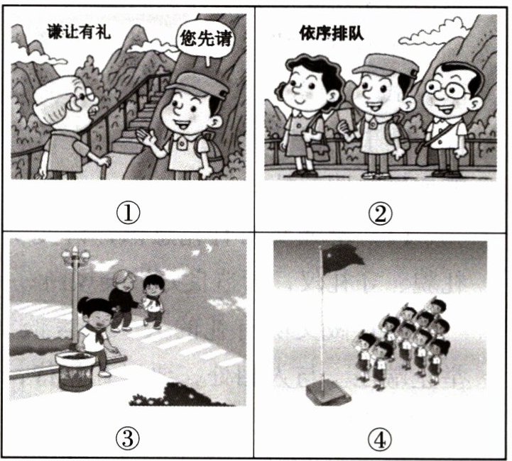 B 【解析】图一中使用礼貌用语代表的是文明有礼。图二中依序排队属于文明有礼的表现。图三扶老人过马路、爱护环境也属于文明有礼的表现。图四体现了升国旗时肃立、行注目礼。四幅图片均聚焦文明有礼。