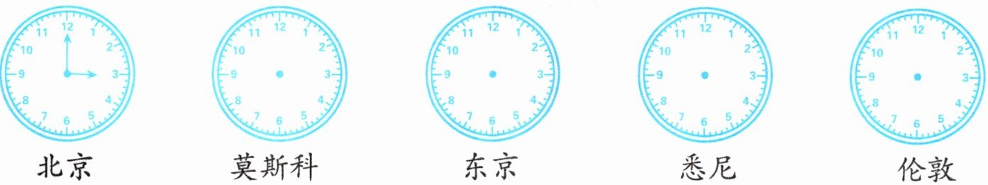 根据上表信息,在下面的钟面上画出北京时间 $15:00$ 时其他城市的当地时间。