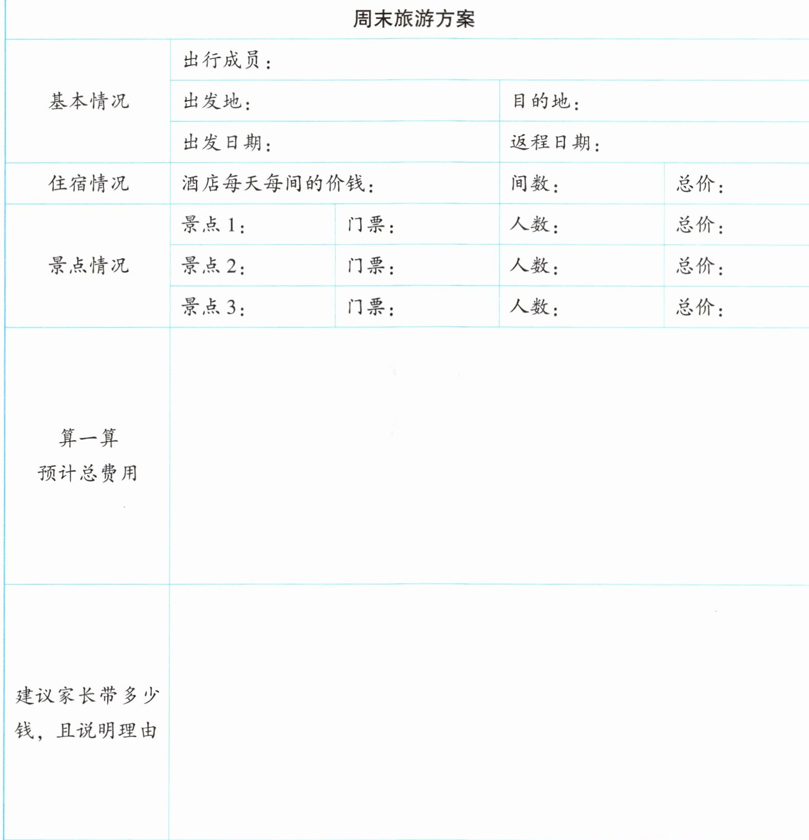 请你通过各种途径查阅资料,为全家制订一份简单的周末旅游方案。