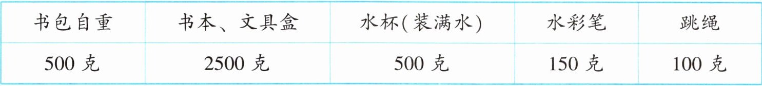 3. 阳光小学积极开展“为书包瘦身”活动。佳佳是一名三年级小学生,她的体重是 35 千克,书包不宜超过 3500 克。她书包内的物品质量如下。