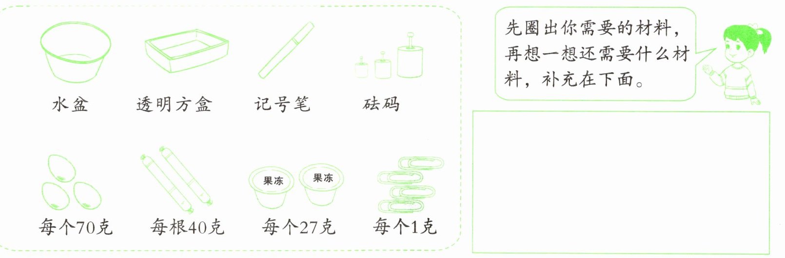 圈出:透明方盒、记号笔、每个1克的砝码;补充:一叠A4纸(100张)。